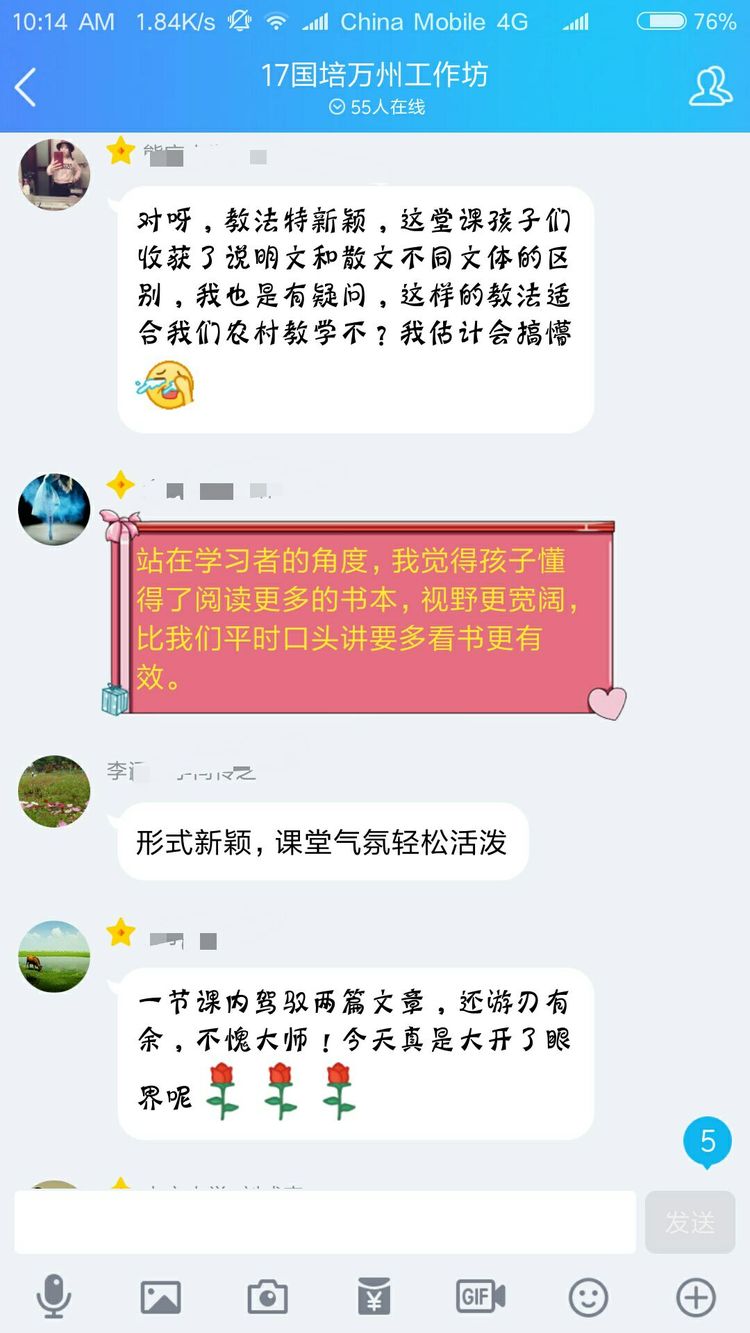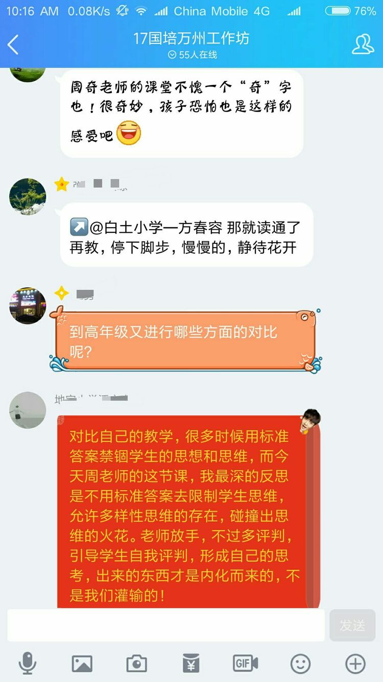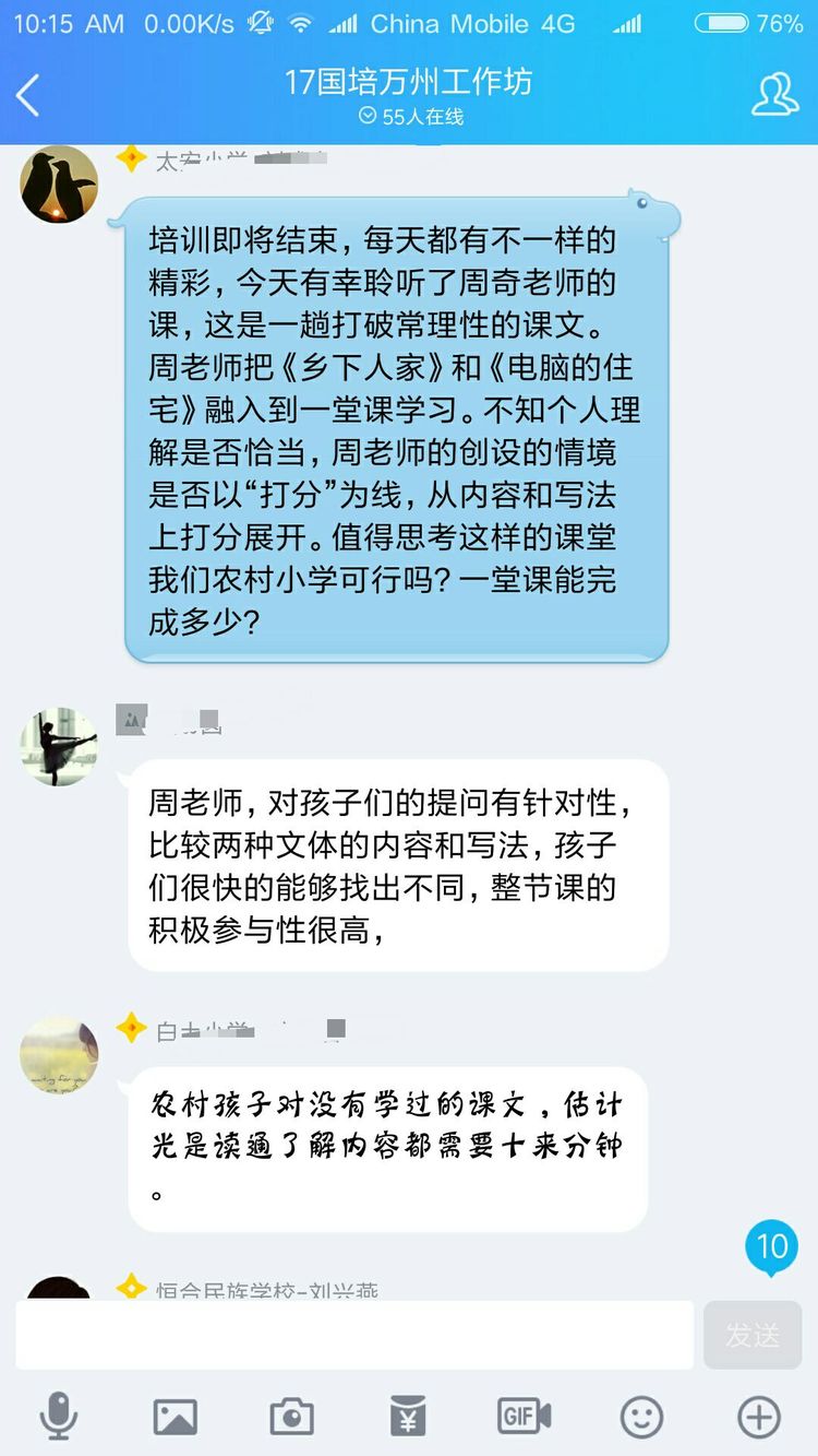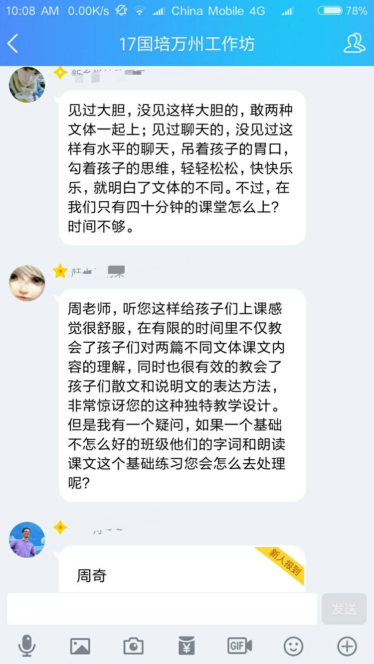 當(dāng)然不是啦,認(rèn)真參加培訓(xùn)的老師們?cè)趺瓷岬猛媸謾C(jī)呢。其實(shí)是周奇老師讓大家對(duì)現(xiàn)場(chǎng)教學(xué)進(jìn)行點(diǎn)評(píng),讓每一位老師將點(diǎn)評(píng)文字發(fā)在QQ群里,然后對(duì)參訓(xùn)老師一一解答疑問。以下分享老師們的點(diǎn)評(píng)
