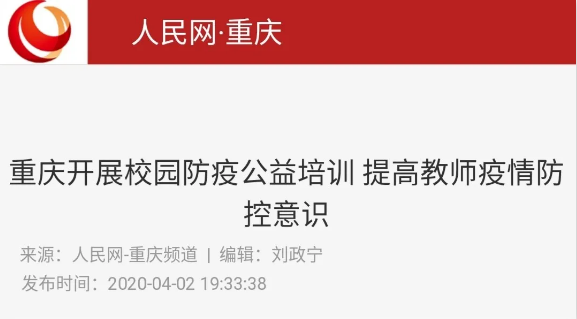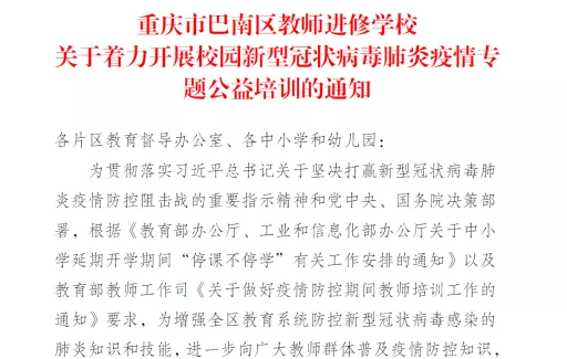 為進(jìn)一步向廣大教師群體普及疫情防控知識,提高防范意識,掌握疫情防控技能,重慶市中小學(xué)教師發(fā)展中心攜手高教社教師發(fā)展中心,面向重慶市廣大中小學(xué)幼兒園教職工開展校園防控新型冠狀病毒肺炎疫情專題公益培訓(xùn)。