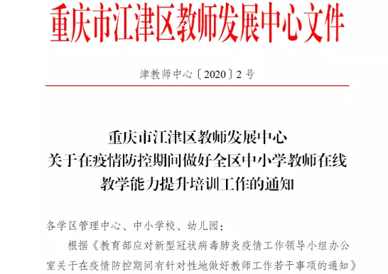 江津區(qū)教師發(fā)展中心下發(fā)《關(guān)于在疫情防控期間做好全區(qū)中小學(xué)教師在線教學(xué)能力提升培訓(xùn)工作的通知(津教師中心〔2020〕2號)》,強(qiáng)調(diào)各單位要充分利用“國培計劃”學(xué)習(xí)平臺,積極引導(dǎo)、鼓勵教師充分利用網(wǎng)絡(luò)平臺免費開放共享的優(yōu)質(zhì)教師培訓(xùn)課程,自主選學(xué),開展線上自主研修。區(qū)內(nèi)63所學(xué)校1069名教師參與到了此次培訓(xùn)中。