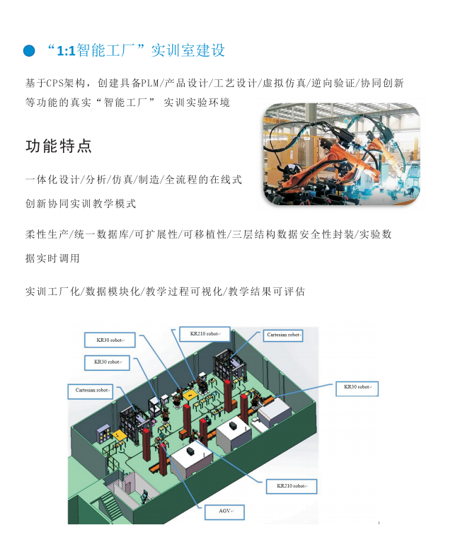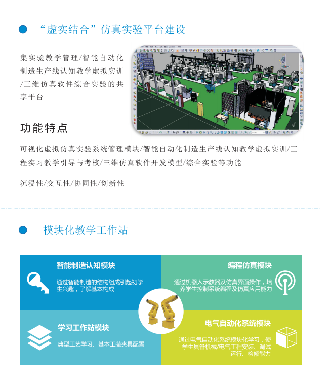 針對智能制造教育,為高等院校/中職院校全力打造智能制造創(chuàng)新教學體系建設(專業(yè)建設/師資培養(yǎng)/教學管理服務/資格證書認定/協同創(chuàng)新教學環(huán)境搭建);提供“1:1智能工廠”實驗室/“虛實結合”仿真實驗平臺/數字資源及現代應用技術實驗室建設,實現從虛擬到現實的智能制造實訓教學平臺。